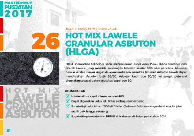 HLGA merupakan teknologi yang menggunakan aspal alam Pulau Buton tepatnya dari daerah Lawele yang memiliki kandungan bitumen sekitar 30% nilai penetrasi bitumen, namun setelah minyak ringan diuapkan maka nilai penetrasi bitumen Asbuton Lawele dapat menghasilkan Asbuton butir 50/30. Asbuton butir tipe 50/30 ini sangat potensial digunakan sebagai bahan substitusi aspal pen 60.