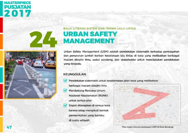 Urban Safety Management (USM) adalah pendekatan sistematik terhadap pencegahan dan penurunan jumlah korban kecelakaan lalu lintas di kota, yang melibatkan berbagai macam disiplin ilmu, sudut pandang, dan stakeholder untuk menciptakan pendekatan yang terpadu.